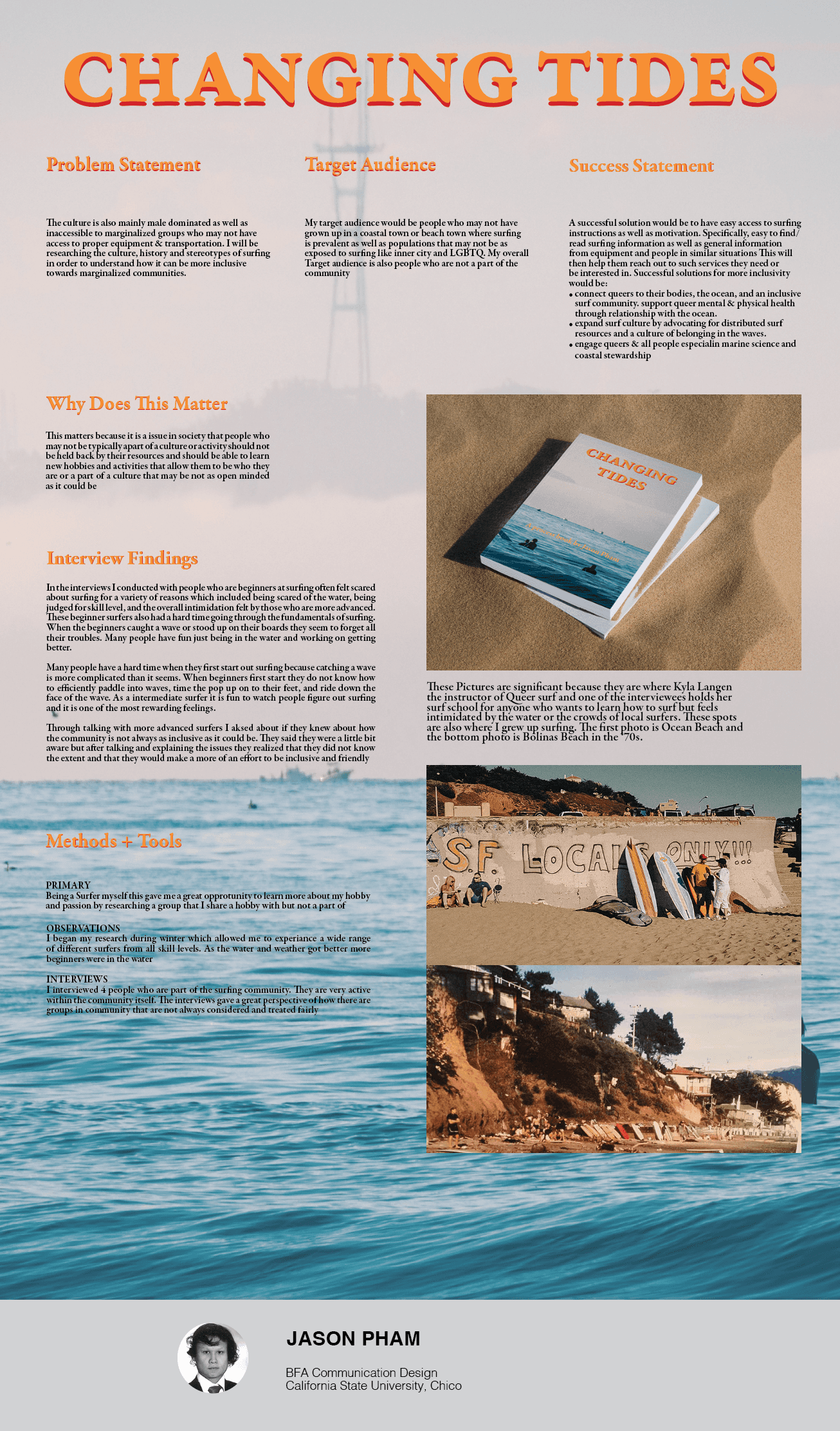 Over the semester I conducted research and put together the findings into a cohesive set of photo journals as well as a poster documenting all the highlights of the project. This project meant a great deal to me not only because it tackled an issue that I feel should get more attention than it has but because it also is comprised of mainly pictures and stories from my hometown. I consider this an Ode to my hometown because of the history and the progressive changes that It has gone through. Although the town has changed from a surfer & local only place to a place where anyone can go surf and share the ocean it still feels like the same town that I grew up in.