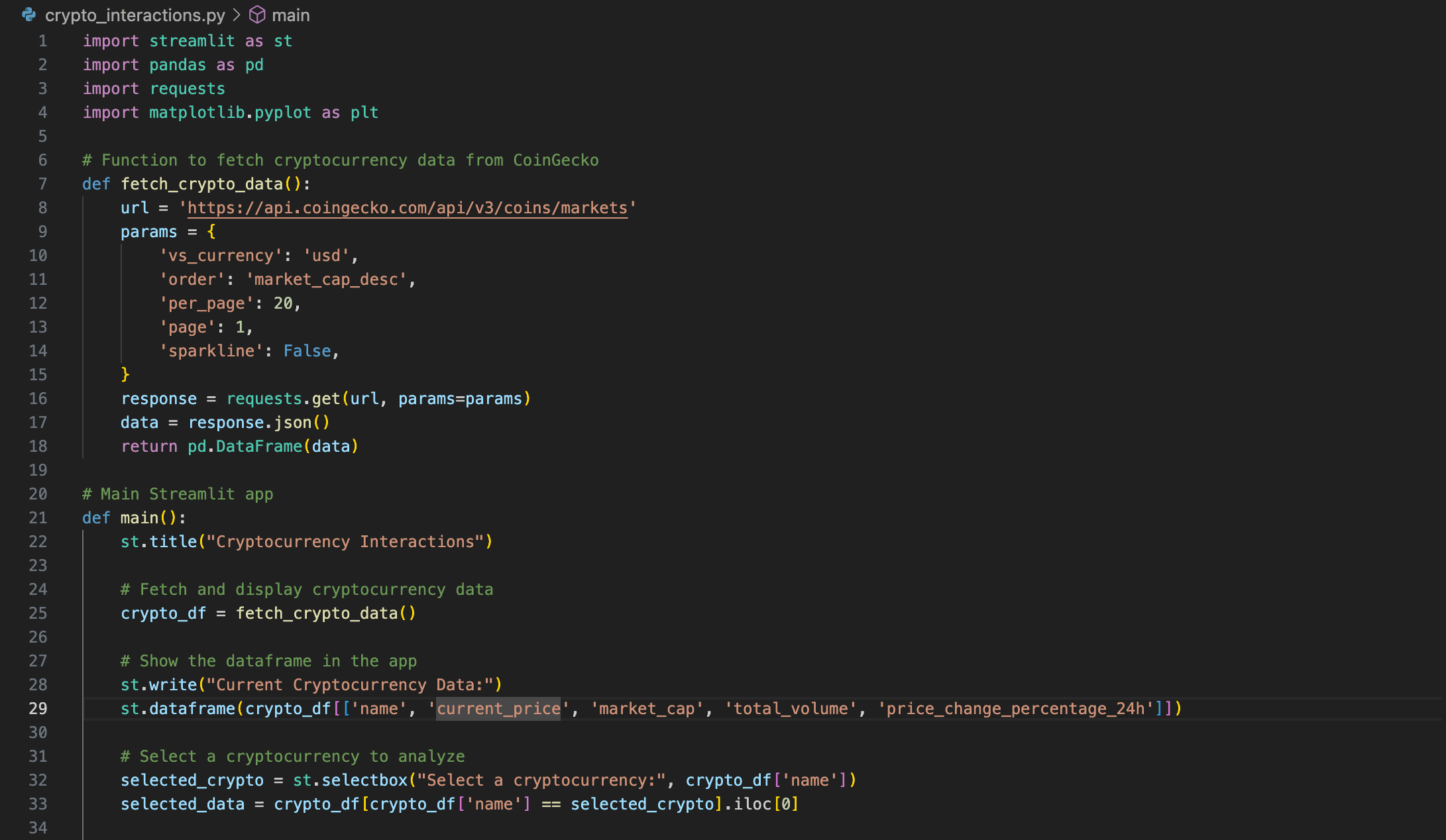 I built a function to fetch cryptocurrency data from CoinGecko’s API, applying filters for the top 20 cryptocurrencies by market cap.